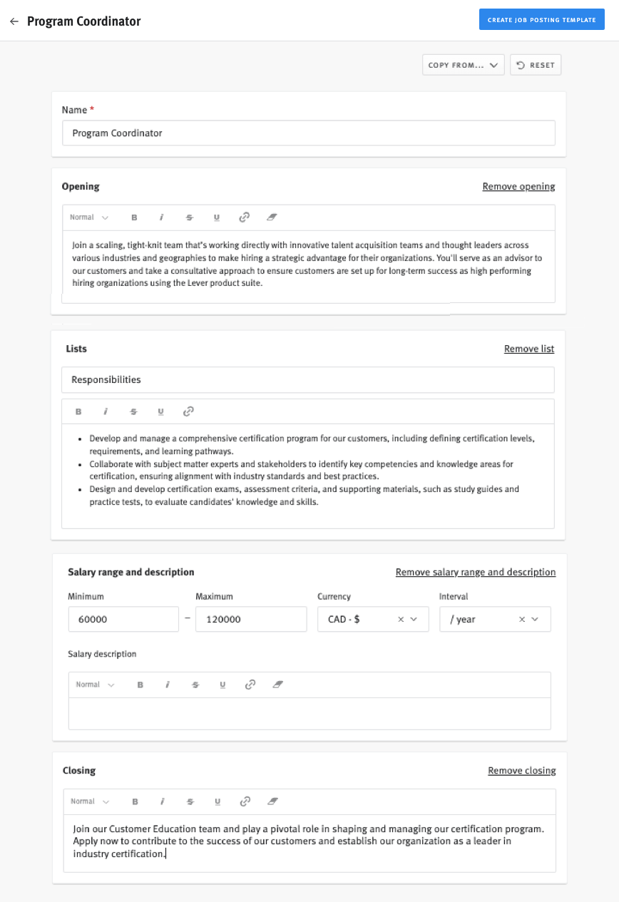 Once your impact description is complete, tun it into a job posting template to quickly draw from in the future. All the hard work you put in up front will save you time in the future. For more information refer to our help article on creating and using job posting templates.