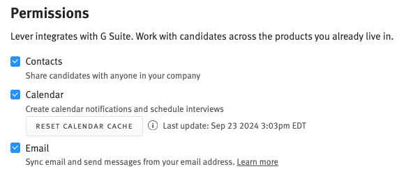 While checking this box technically gives Lever these permissions, there aren’t currently any features in the product that use this information. Lever users can leave this box unchecked if they want, and it will have no impact on the functionality of the email/calendar integration.