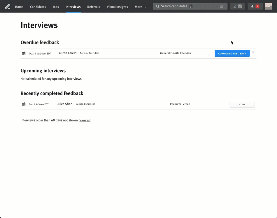 Working on the go? Though working out of a browser is the optimal experience, you can also complete interview feedback on a mobile device. To learn more, refer to our help article viewing interview activity on mobile. |