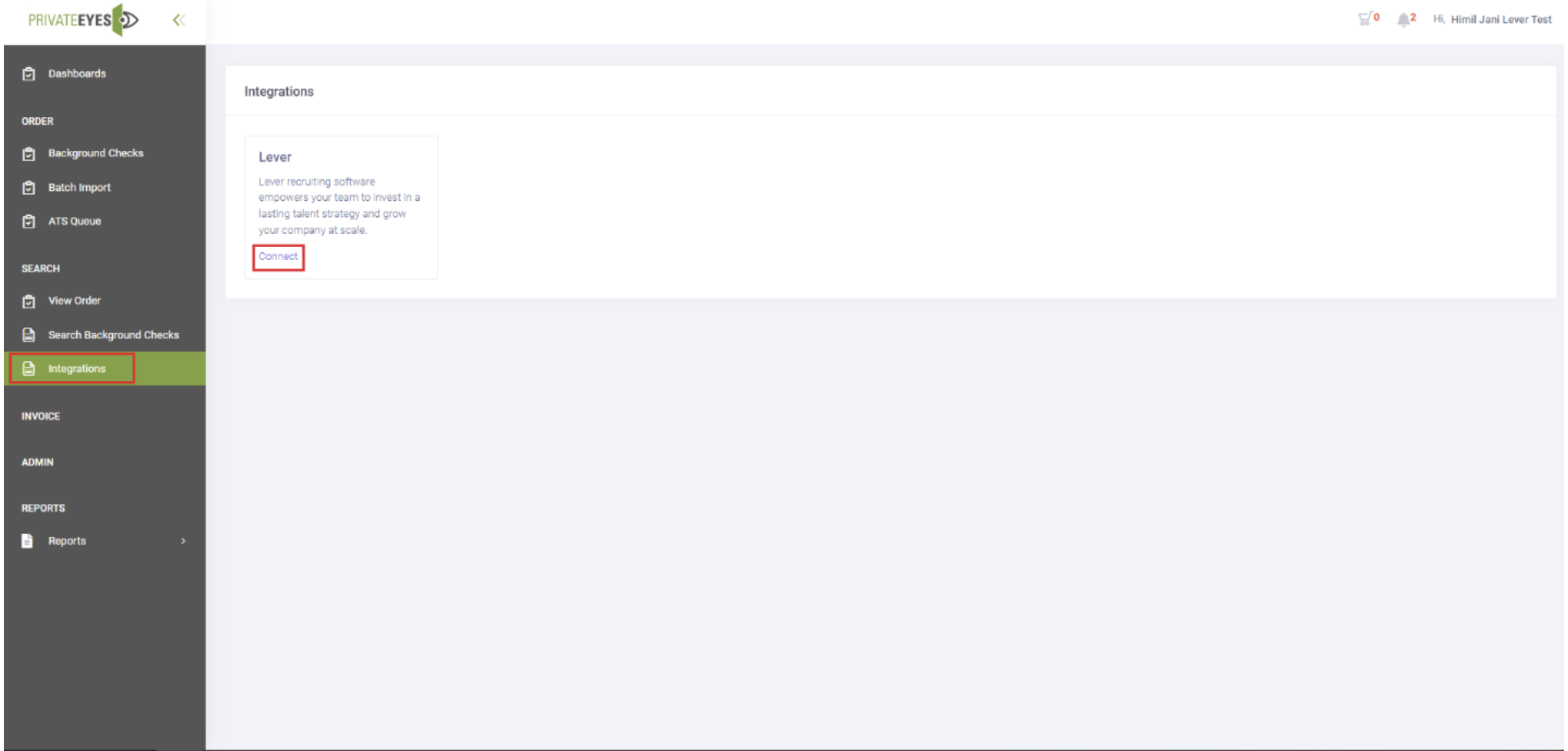 - Reach out to your Private Eyes Account Manager to request the Lever-Private Eyes integration.