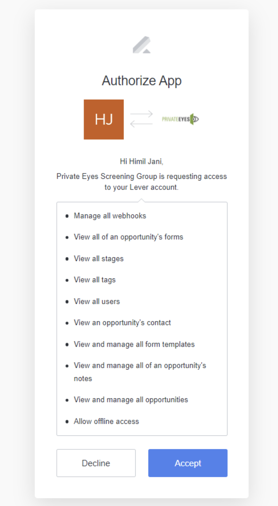 The Private Eyes team will work directly with you to configure the required forms, stage, and webhooks on your Lever account to support the integration.