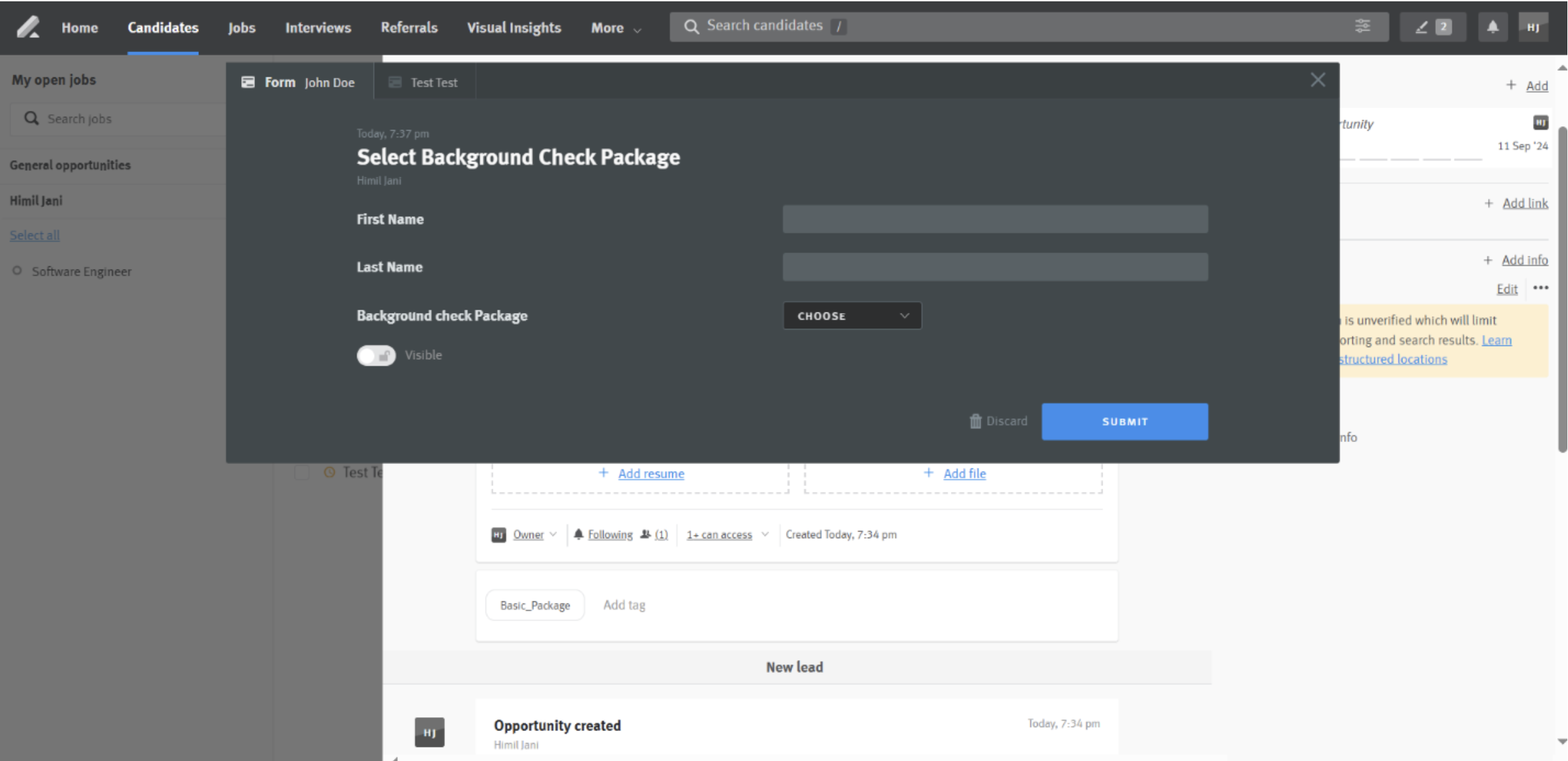 - Add a new Private Eyes 'Background Check Package' form to the Lever opportunity. For more information on forms, refer to our help article on adding forms to candidate opportunities.