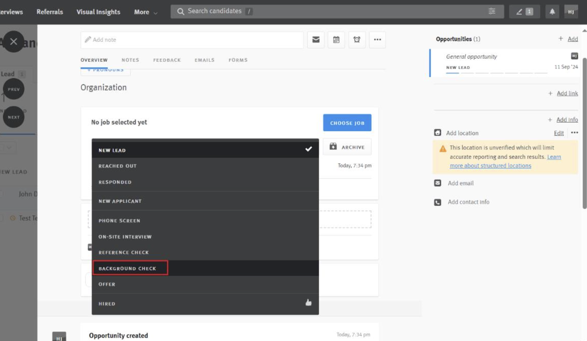 - Once the background check package, candidate name and email are available on the opportunity, move the candidate to the 'Background Check' stage in Lever.