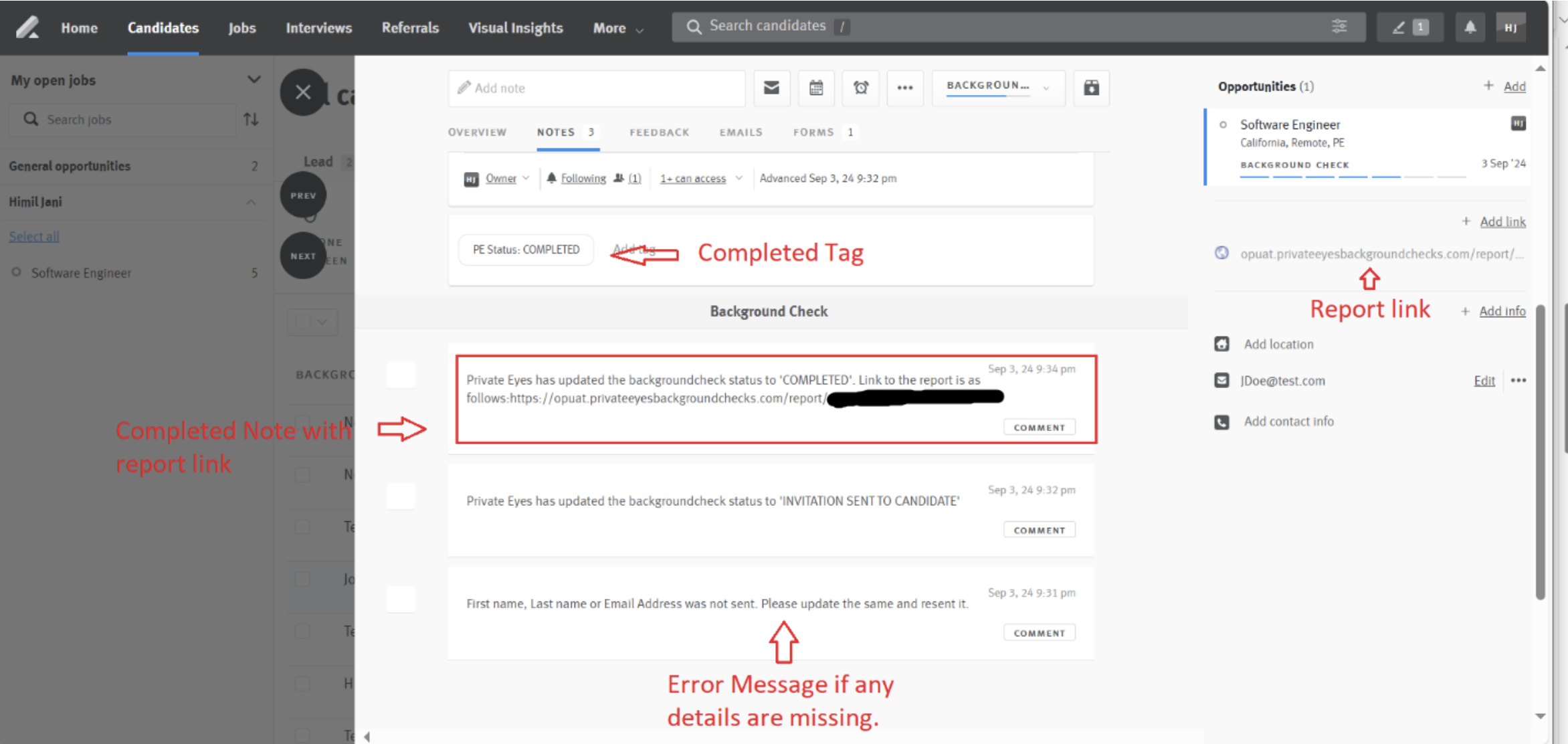 - The candidate will automatically be sent an invite email to complete the background check and the integration will add a note and progress tag to the Lever opportunity.