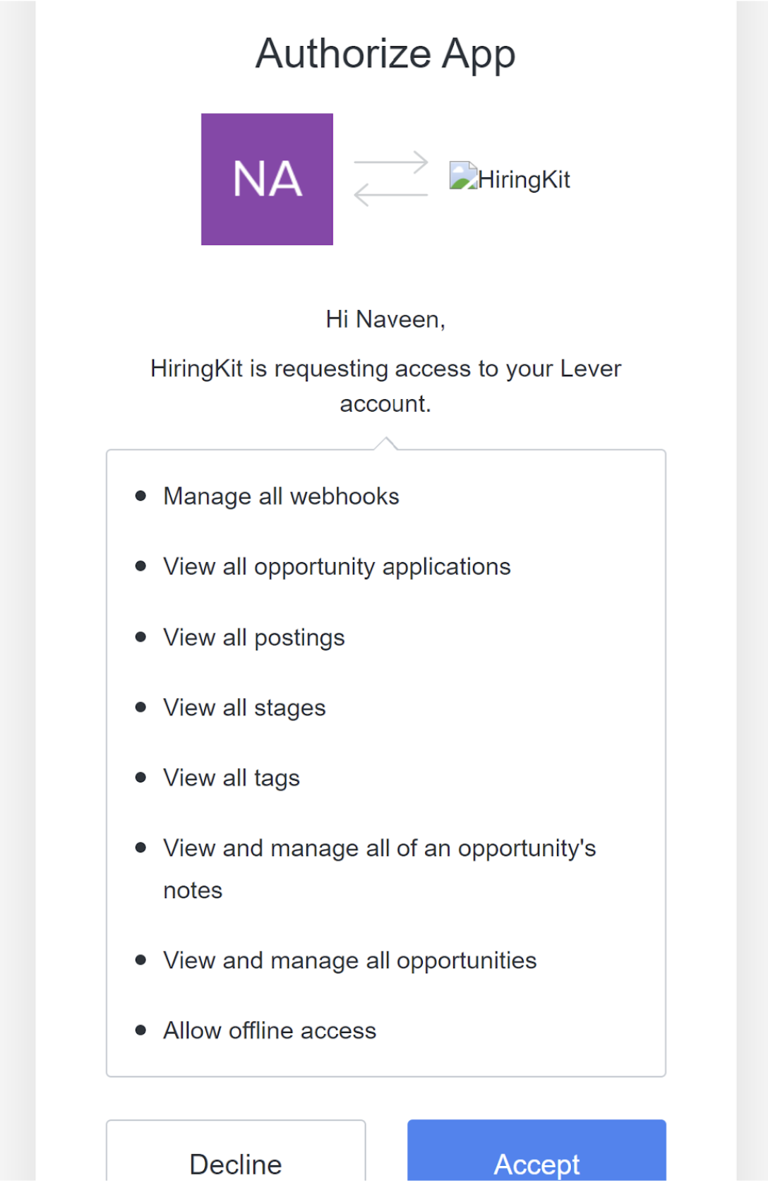You must be a team or organization with admin rights in HiringKit to install this integration. |
