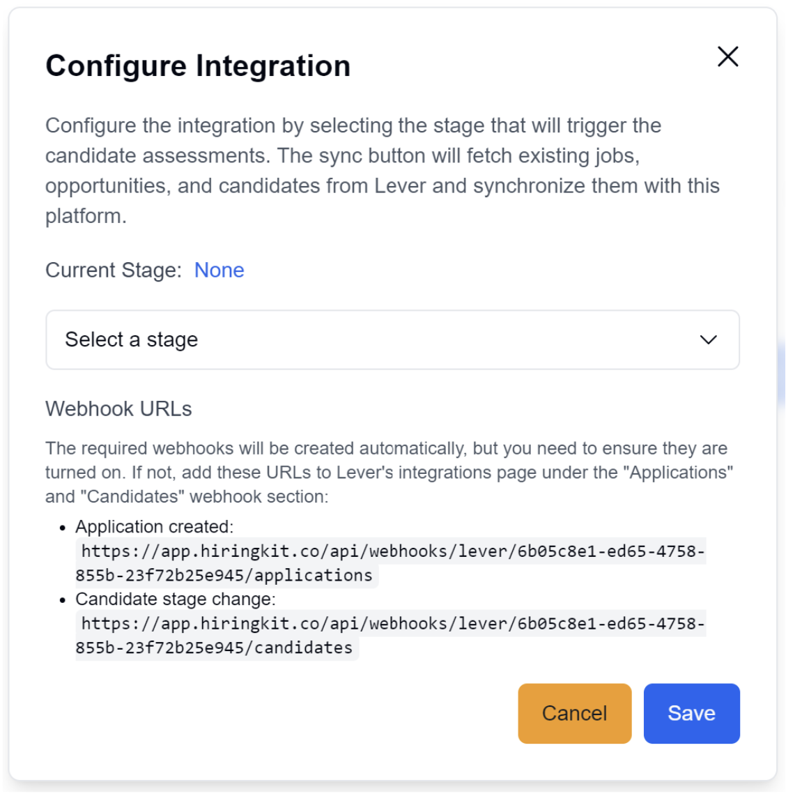 - Select a Lever stage (e.g., "New Lead", "Reached out", or Custom Stages such as "HiringKit") that will automatically trigger the assessment invitation for candidates.