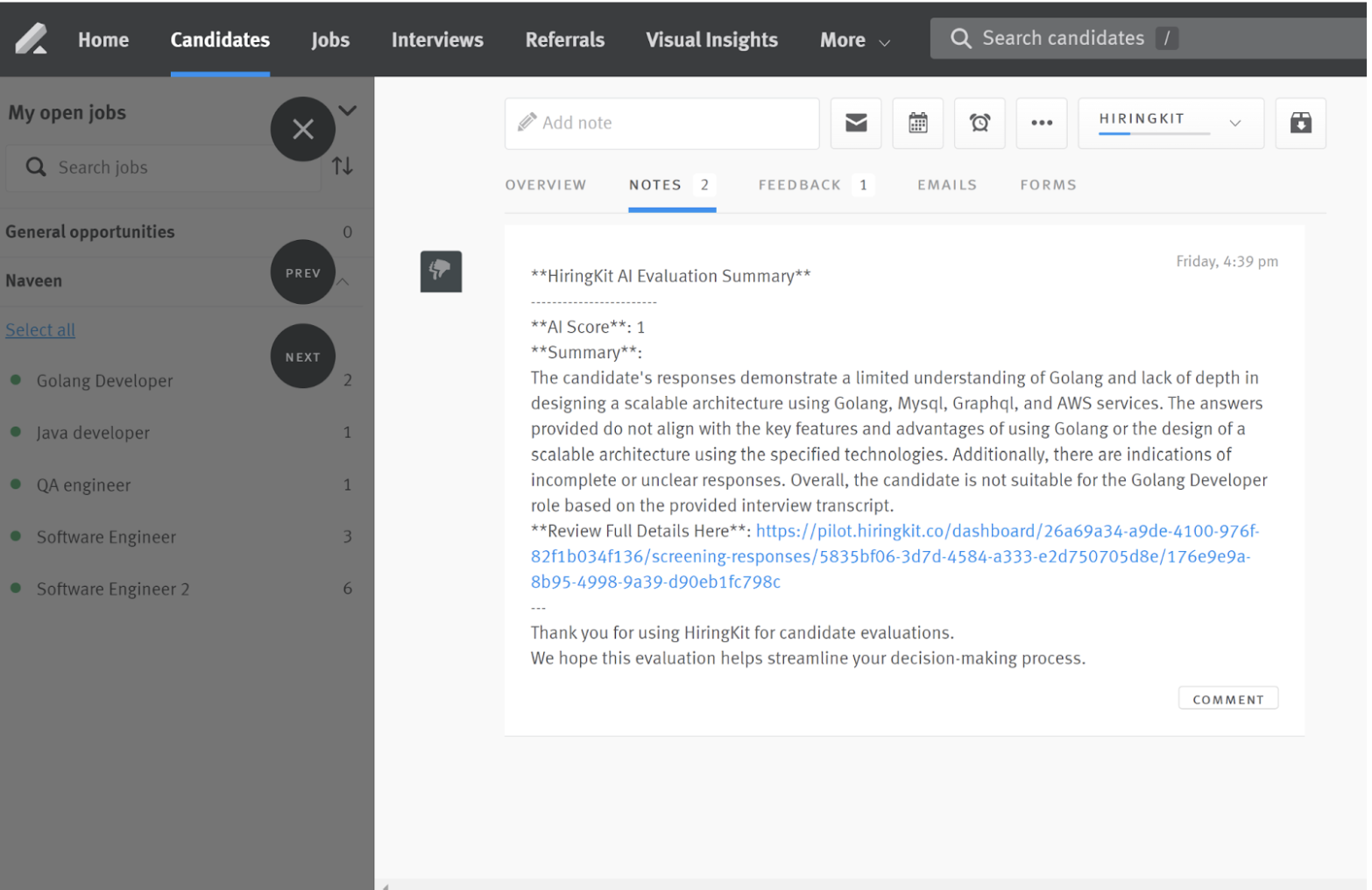After a candidate completes the screening, HiringKit will automatically send AI-generated scores and detailed evaluation notes back to the candidate opportunity record in Lever. These notes will appear under the candidate’s 'Notes' section and include a link to view the full screening response in HiringKit.