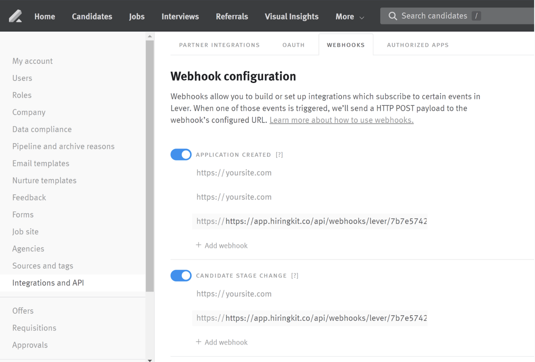 - After authorizing the integration, go back to Lever and navigate to Settings > Integrations and API > Webhooks.