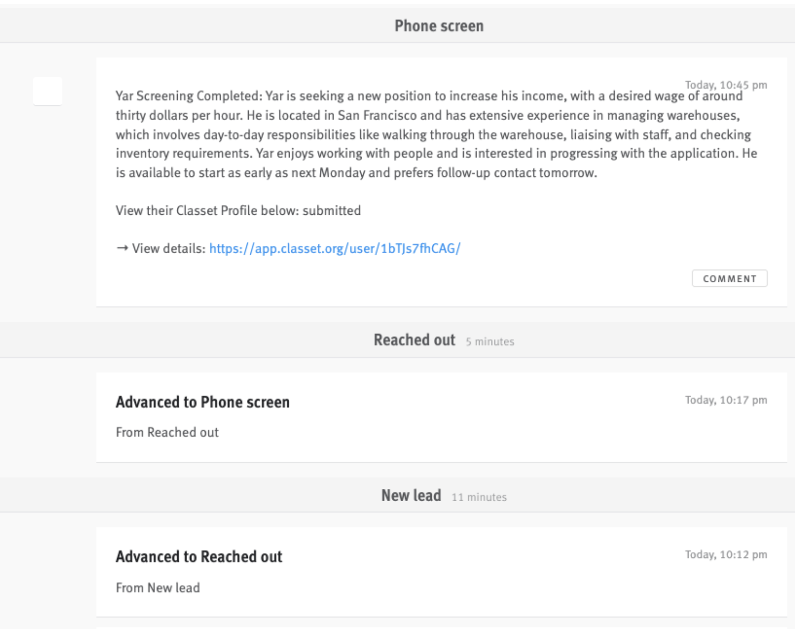 The candidate will automatically be moved to the next stage. In the example below, the candidate status was updated twice (New Lead → Reached out; Reached Out → Phone Screen).