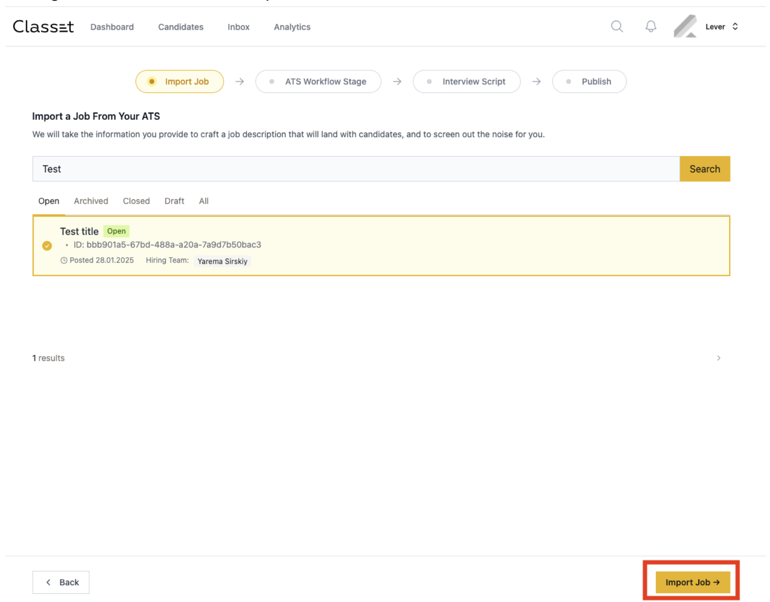 - After you get redirected to the Job Import screen (https://app.classet.org/job/import/), search for a job, select it and click Import Job