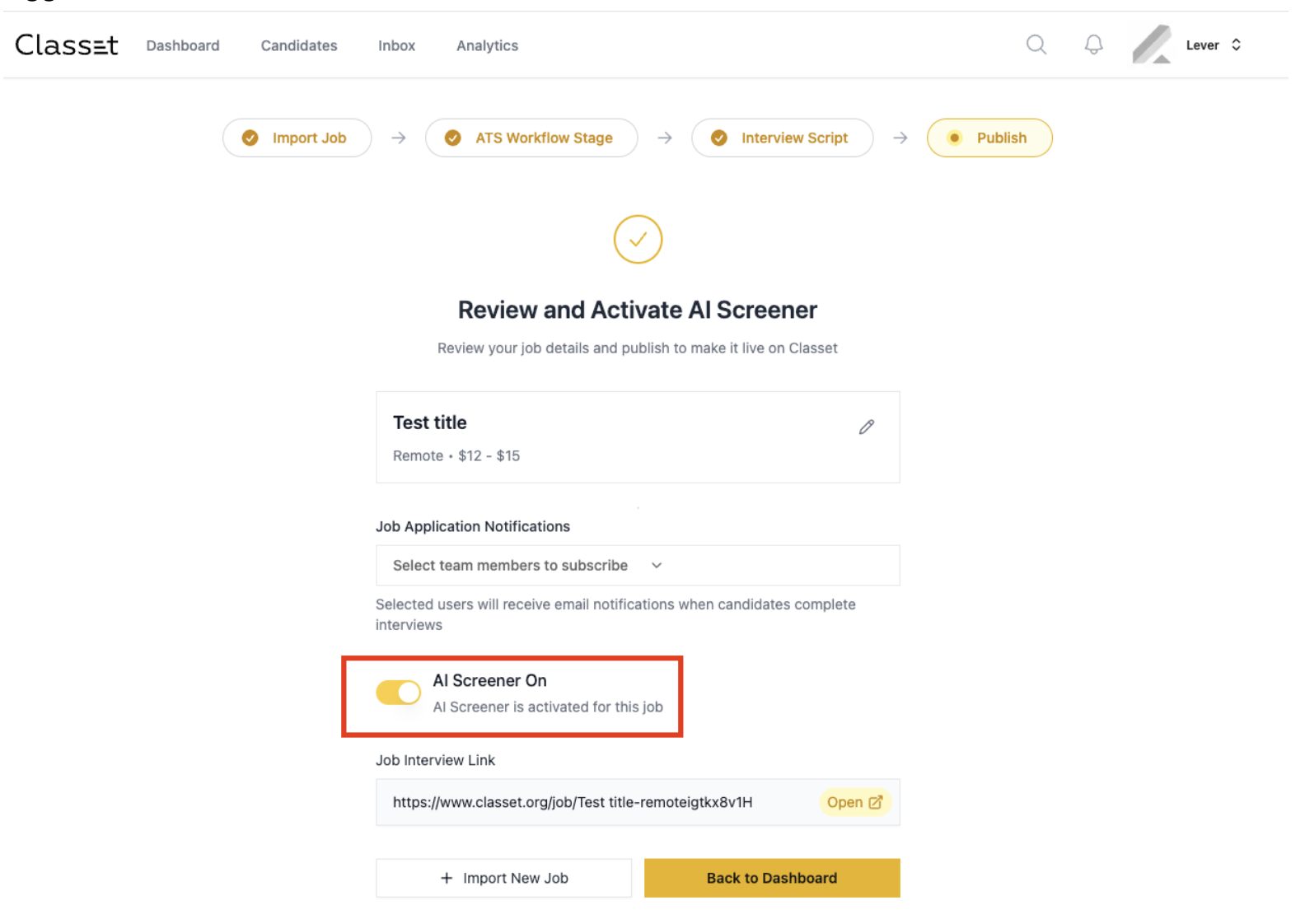 - At the Publish step, review a summary of the Job Import configuration & enable or disable the AI Screener On setting, as desired.