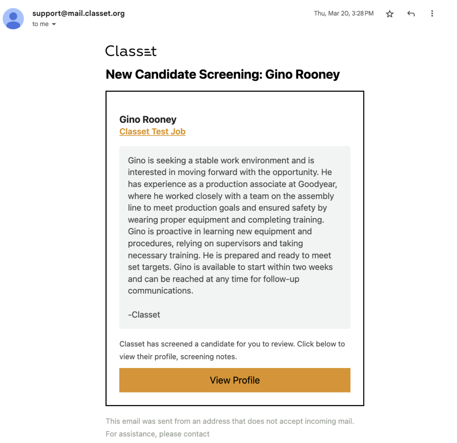 When candidates complete their screening, subscribers on the job will also receive an email notification as well: